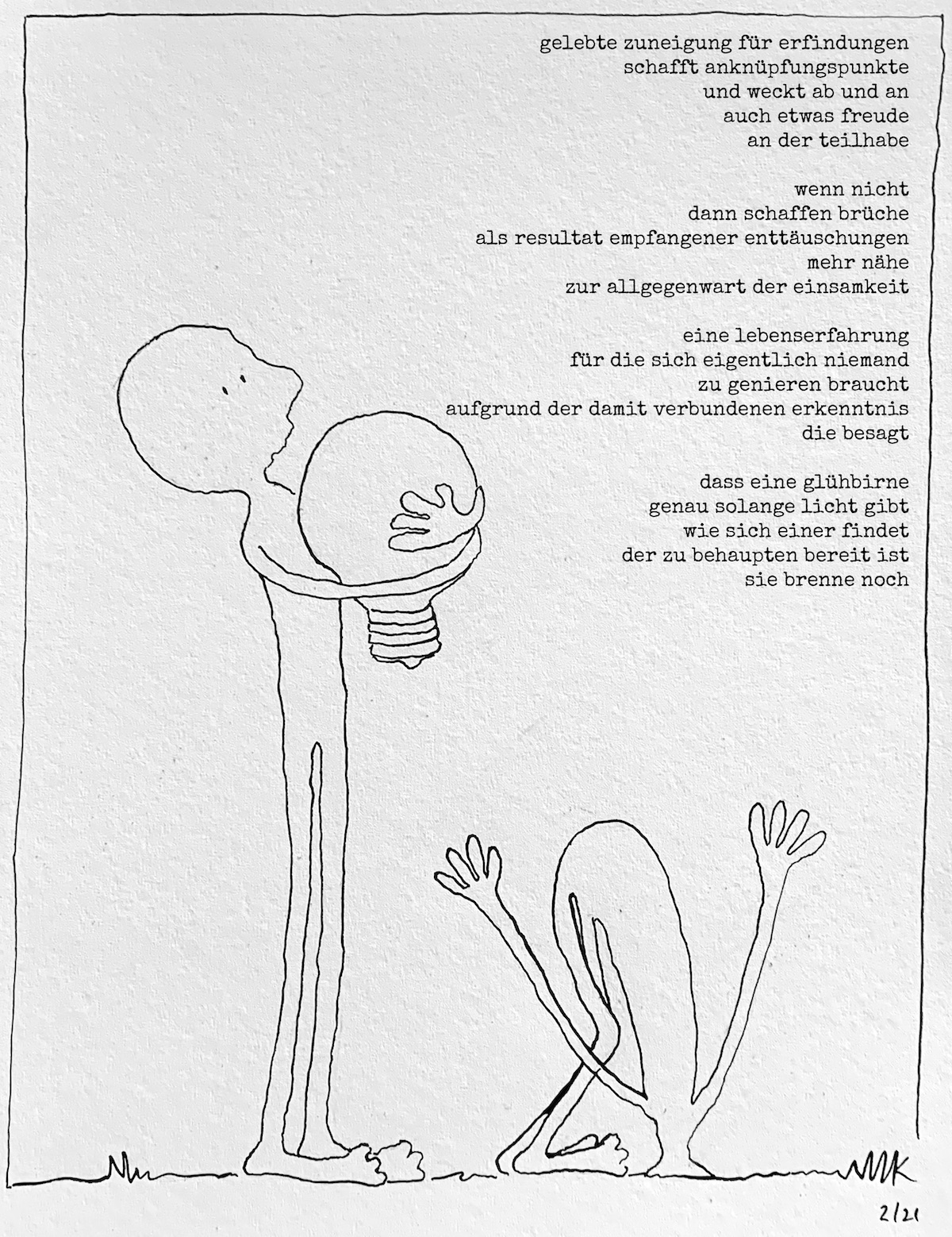 dialogische Zusammenarbeit Bilder – Lyrik – Briefe – der Duft und Geruch des Papiers aus der Versandtasche genommen, um über den Rand und Grad zu kommunizieren. Über diesen Bericht – Interview – Zusammenfassung weiter zu lesen, schreiben und die Information zu tragen. Da diese mir mehr als gefallen (gefallen, klingt & tönt jetzt ziemlich platt, banal und einfallslos) – ebenso wie lesenswert. Doch wie wäre auf einen solchen Beitrag mit „Lass den Knüppel im Sack und teile Deine Denke mit uns…“ zu reagieren?! Und schwarz etwas unaufdringliches zu attestieren, dies ist die Höhe der Zeit, die es dem*r betrachtenden überlasst so viel spielraum um das bild für sich selbst auszumalen: vergleichbar dem freien und schwindelerregenden Fall aus höchster Höhe beim „spring vom dach“. (Welches als paradoxe Intervention aufzufassen wäre, denn als konkrete Handlungsanweisung für den Patienten pierroz im Kunstsanatorium wäre es zu lebensgefährlich) *Wie wirklich ist die Wirklichkeit* (#PaulWatzlawick). Und ja, wie fühlt es sich jetzt an (Beziehungsaspekt der Kommunikation), wenn jemand, so wie ich, und den du eigentlich kaum kennst, auch mit sprache & Text unter deinen bildern, Musik, Blog und Bericht sowie Eurer Zusammenarbeit kommentierend stümperhaft & repetierend herumfuhrwerkt?! So viel kann ich quasi zur Entschuldigung & Empathie vorweg mitteilen: auch ich habe lange ausschliesslich „für mich selbst“ für die schwarzen Mappen und in die Blanko-Bücher gemalt. Und vermutlich fühlte ich mich von dieser Aussage, Argumentation und Stellungnahme sofort in- und affiziert. Ja, und dies ist zwar schön und gut, aber irgendwann erstickt man in seinen eigenen auswürfen (ausdrücken) und kann sich selber nicht mehr (sehen, geschweige denn) „hören“. ((oder die eigenen Arbeiten & Texte nicht mehr lesen, editieren oder redigieren)) Da kam mir die Idee zwei #Sauerteigkulturen in Weizen (heute Weissmehl) und Roggen (heute eingetrocknet) anzulegen und zu pflegen, um #keinebrotloseKunst & #kunsttalk etc. als Kollaborationen (neben der Projektarbeit) zu initiieren. Mir machen solche projekte, wie ich sie jetzt mit dir – Euch – führe, grosse freude. Aus diesem Beweggrund würde ich mich sehr freuen, Euch im #kunsttalk – mit oder ohne life- und livestreaming – zoommeeting begrüssen zu dürfen, welches vollkommen freiwillig ist. Falls ihr mögt, könnten wir uns per zoom vorab treffen; wie gesagt nur ein Angebot zum Zusammensein