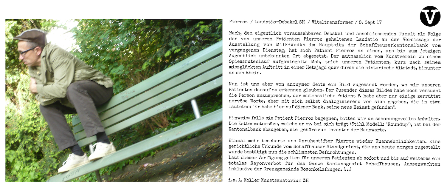 Des Patienten Klage „er fühle sich seit einigen Tagen vom Verderben geschwängert“, sei laut Gabriela, im allgemeinen Stress leider zu wenig Aufmerksamkeit geschenkt worden. Patient Pierroz arbeitete trotz seiner angegriffenen Verfassung aber bis zur Medikamentenausgabe um elf Uhr hart an seiner Erfindung neuartiger Empörungsrituale.