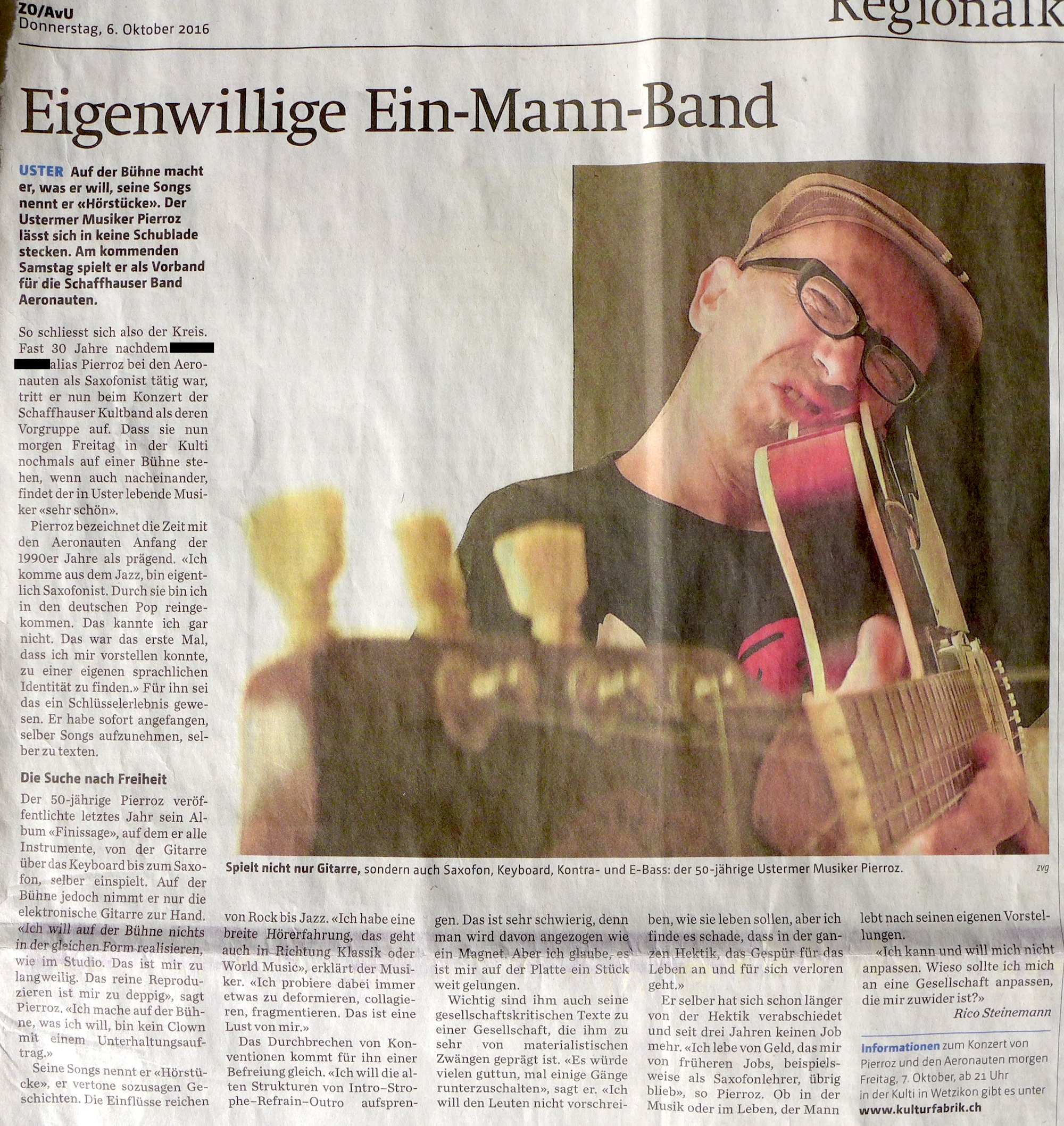 2022 – Unser Patient Pierroz interpretiert »Früh / Spät« aus dem aktuellen Aeronauten-Songbook (Pierroz behauptet, Anfangs bis Mitte der 90ziger Jahre, bei der Band »Die Aeronauten« Saxofon gespielt zu haben, was aber sehr wahrscheinlich Quatsch ist, weil fast alles Quatsch ist, was unser Patient behauptet.)